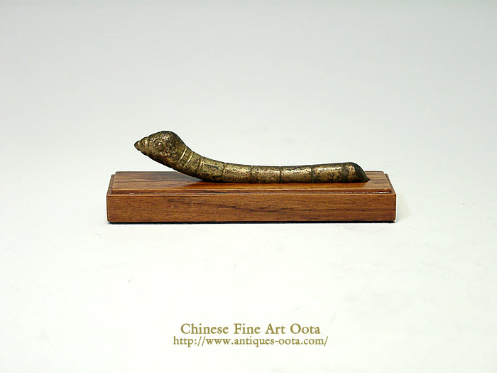 鍍金の残存と銅の味が良い。漢時代の明器で玉製が多く銅製は少ない。写実的に蚕をうまく造形化している。中国における養蚕製糸技術には長い歴史があり、殷・西周時代には玉蚕が出土している。陜西省博物館に蔵された同型品が有名。