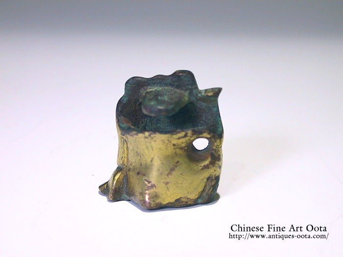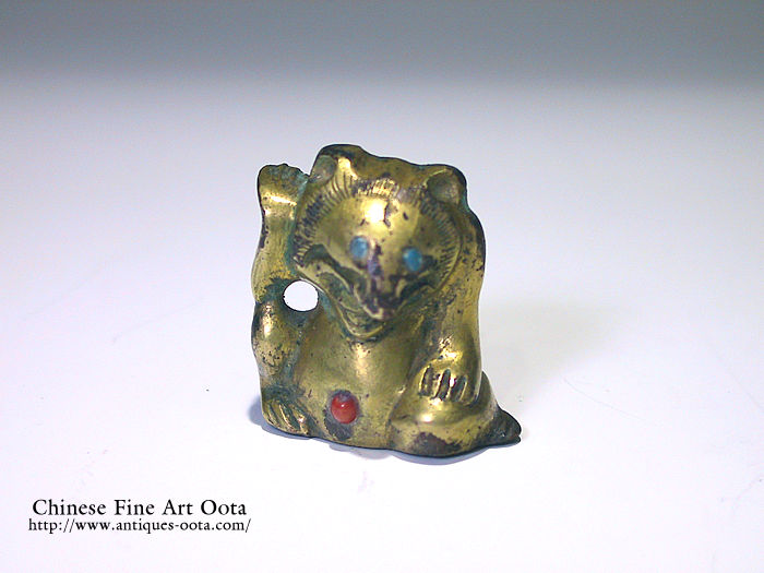 漢時代の人々にとって熊は限りない力の象徴であった。熊は黄河の水を治め、民の安寧に尽くした禹の化身であるという伝説があるが、漢時代の美術においては神話の世界をこえ、力とおかしさに溢れた表現となっている。眼に緑松石、腹部は瑪瑙が象嵌。これと同様の熊の多くは、青銅や温酒尊、鍋などの器脚として作られたもので金色の鮮やかさ、緑松石、瑪瑙の象嵌等から、器全体の見事さがしのばれる。熊脚だと3ヶで支える事となる背部は木胎を組み込む為削り固定の為の柄が有る。