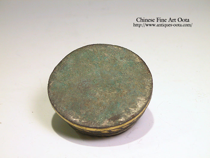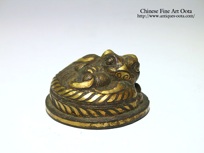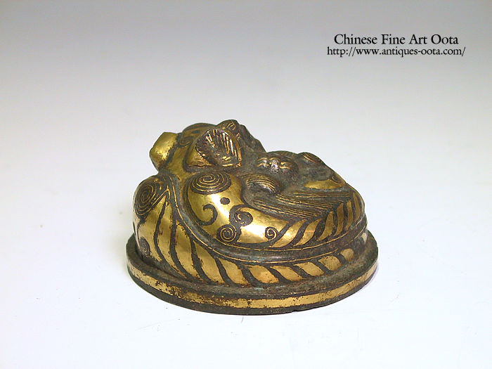 明代には漢代の品を得ることが難しい為倣製され、書斎の机上に置き、はるかな上代の風情を偲び清賞した。後世の人達は、銅鎮が席鎮であったという元来の用途を知らず、紙・書物を押さえる鎮紙書鎮になったわけである。目のみ銀象嵌。 |