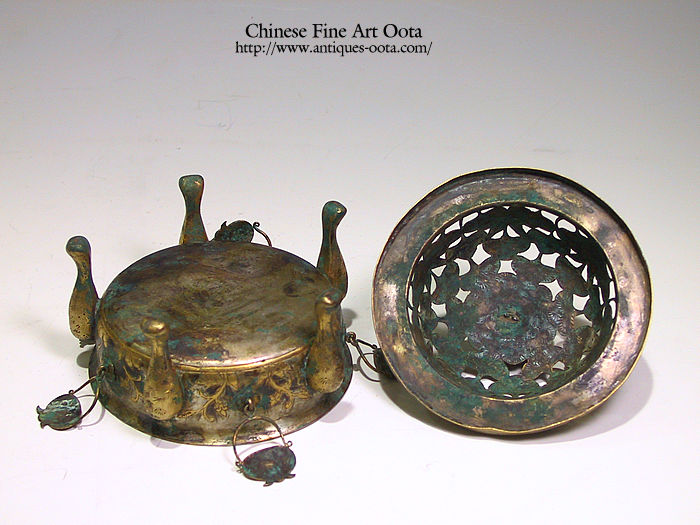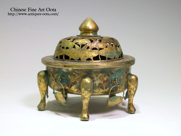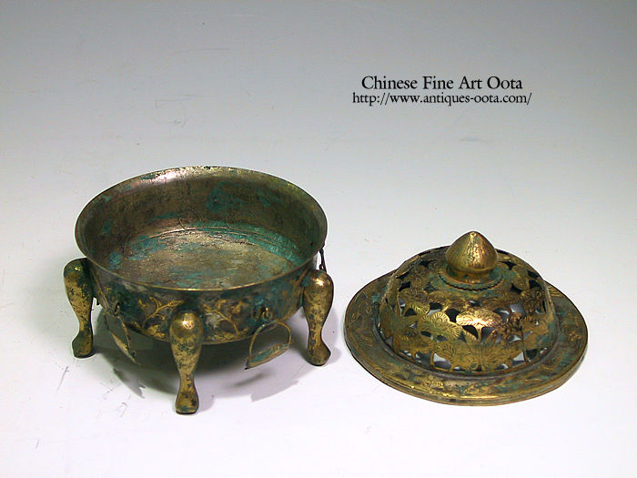 銀板で成型し、模様の部分は金メッキされ爐蓋・爐身からなっている。蓋の縁は広く平らで下方へ折り曲げ、爐身の口縁にぴったりと組み合わさる。 爐棚の縁は鳥・唐草を刻み、蓋は高く隆起し底の縁に一回りの蓮弁文を刻む。蓋頂には蓮華形の鈕、蓋部は松文様が透かし彫りされる。5ヶの獣足の間5ヶ所に盛り籠形状の薄板が吊り下げられている。唐文化の華麗な香りを醸す品。 類品は法門寺からの出土品や薫炉台を伴なう大型品が知られる。