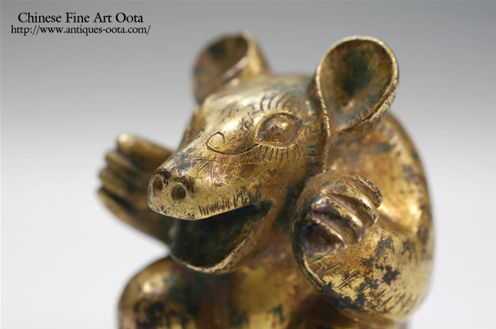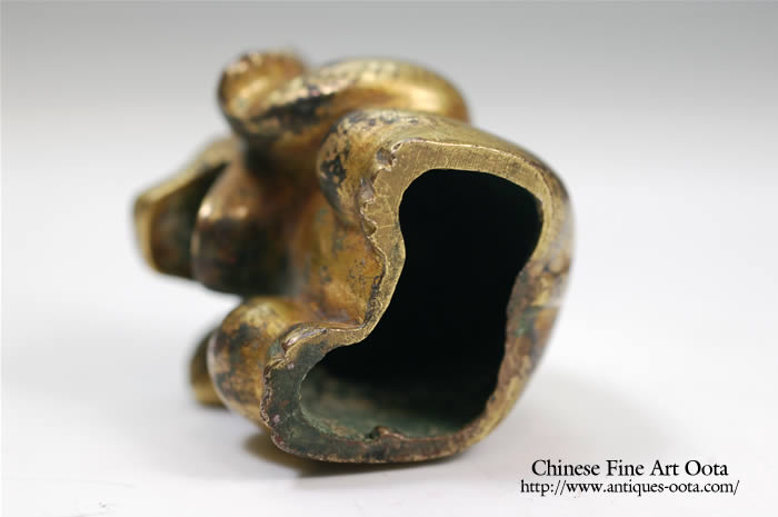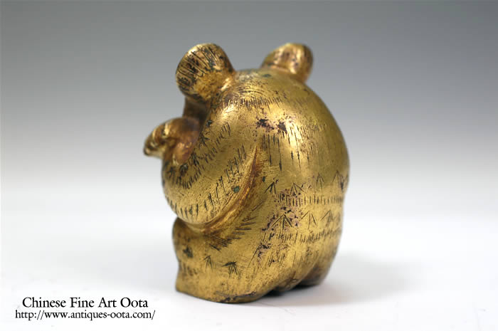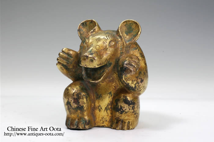 うずくまり、両手を広げ一歩踏み出した漢時代特有形態の熊。体表には線彫りで毛並みが入り、造型は厳しく厚い鍍金とともに魅力ある。 内は空洞であり、鉛をつめて鎮としたもの。熊は吉祥動物であり、辟邪の意味もあったと考えられ、漢時代は多く銅・石でもって造型された。 参照 : DK-107 、 GK-178