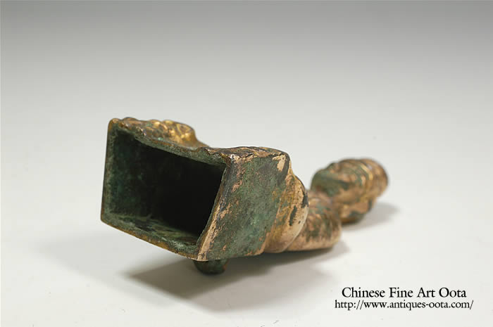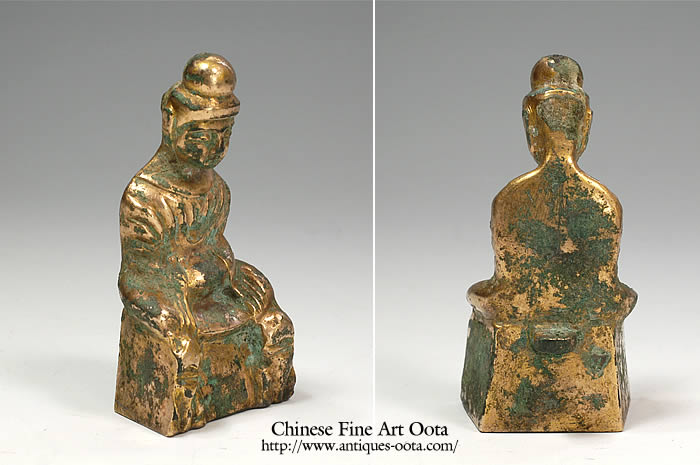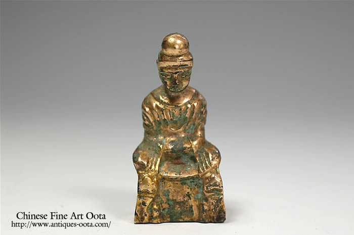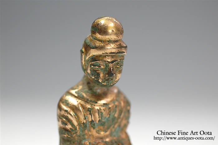 中国に仏教信仰が広がり始めた頃の鍍金仏は、わずかに一・二例が知られているだけであるが、その顔つきや着衣の様はガンダーラ直系の造形を示す。それに続いて恐らく4〜5世紀初頭にかけて、逆に稚拙とも言うべき仏坐像が出現する。中国の北部は北辺の諸族が南下して占め、やがて北魏が統一を果たすことになるが、その頃北地で製作されたものと考えられている。本来は台座の裏面に柄があるので光背を有した。一般に「古式金銅仏」と通称されている。台座の前面に彫り出されているのは守護の獅子を前から捉えた姿で、衣紋や頭髪とともに鋳上がった後で刻出されている。型に彫るのと違って、小さく・固い金属面を刻むために目鼻が顔面に対して大きくやや粗い彫りになるが、それが独特の表情となってあらわれる。