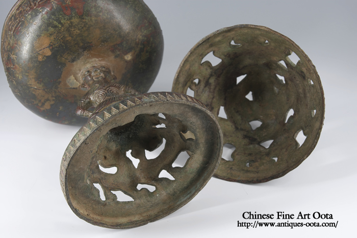 博山炉は漢代の香炉で最も流行した形であるが、これ程の大型優品を所持できたのは灯火器と共に極めて富裕者に限られる。損傷なく西安収蔵家に長年月秘蔵。伝来の銅と錆との緑・赤の撫玩銅味は素晴らしく魅力的な雅味が有り、陶磁とは違った幽玄さを醸し古玩鑑賞の醍醐味。