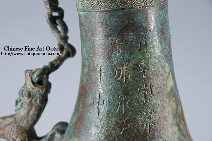 弧型瓶の前後首部には銘文が3行づつ陰刻。胴部には4段の帯上に細瑞雲紋が稠密に装飾。咆哮する瑞鳥の蓋と胴部に形成される瑞獣が環で繋がり、鳥口から放水できる。瑞鳥・瑞獣の体表には密に瑞雲・多様な紋様が陽刻される酒壺。