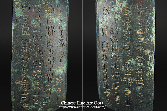 側面に始皇帝が度量衡統一を命じたとする銘文を側面の長手方向に合わせた縦書きで刻む。左右側面は4行、底は5行。