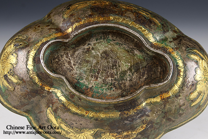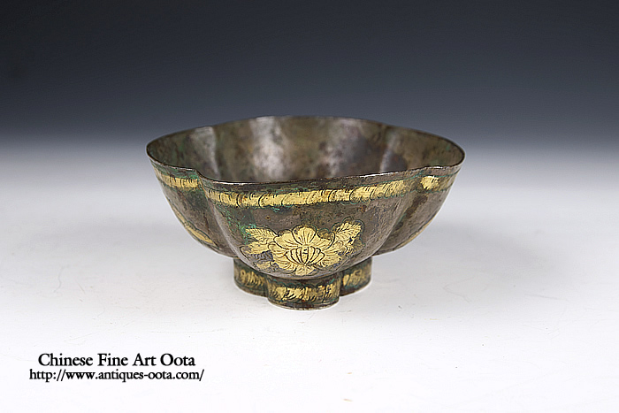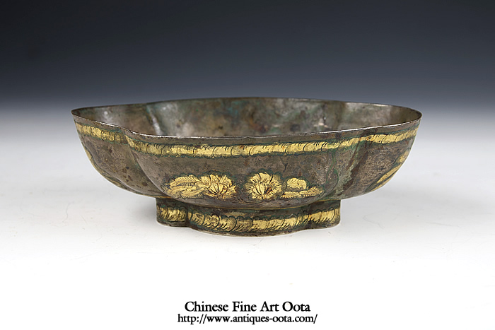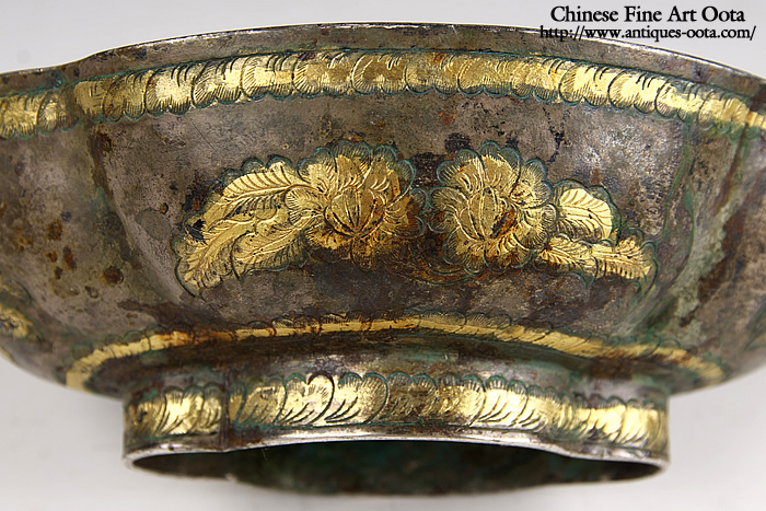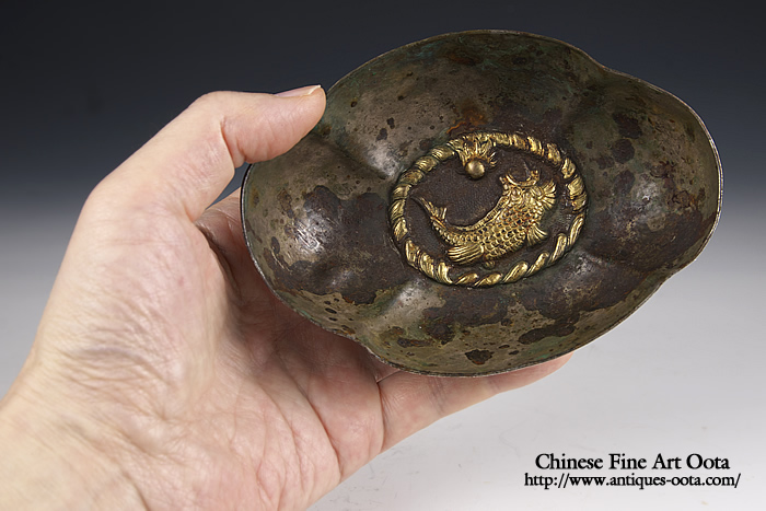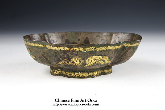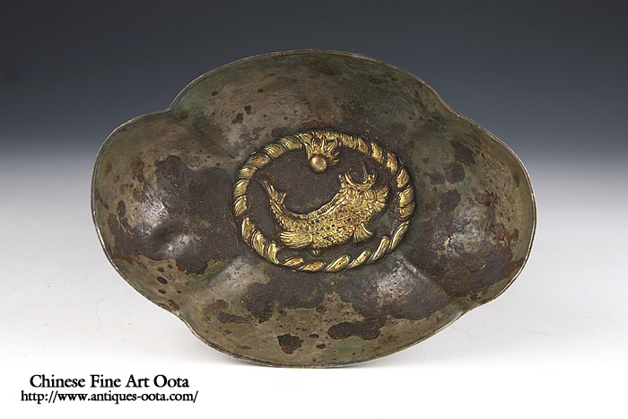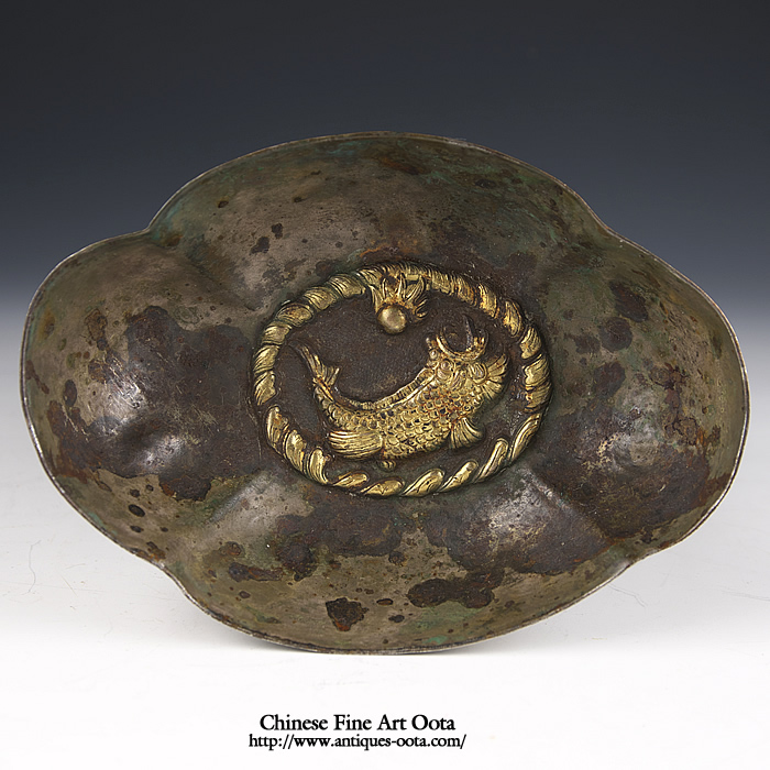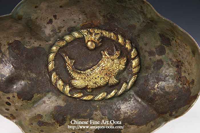 楕円形の皿4箇所に刳り込みが入った四花杯。 内底に魚紋と波文が陽刻され鍍金、地は魚子打。外周には葉文繋ぎが上下に、四区には花文が線刻され鍍金。 杯の文様にしばしば魚文が採用されるのは杯中に酒や茶と言った液体を満たした時その底に魚紋が見え隠れし、あたかも水中の魚を愛でるかのような趣向となるのがとりわけ好まれたため。 唐時代晩期の作風を示すが、この時期の銀器の作例の中では形姿が良く整い、鏨使いも精密で非常に良質の出来栄えを見せる。