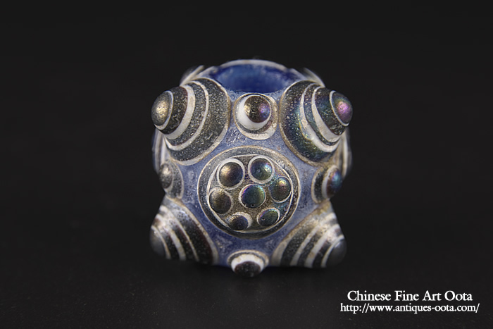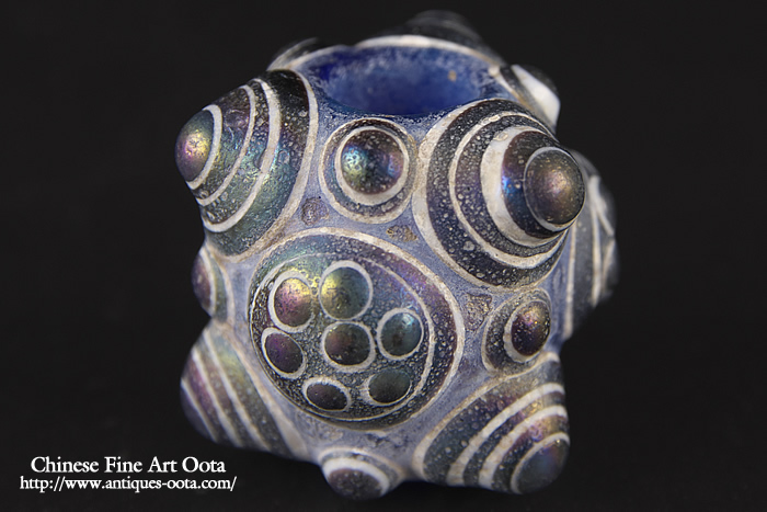 青玻璃地には極めて珍しく珍重された七星紋と間に丸紋を装飾した金平糖型大型。珍品。
