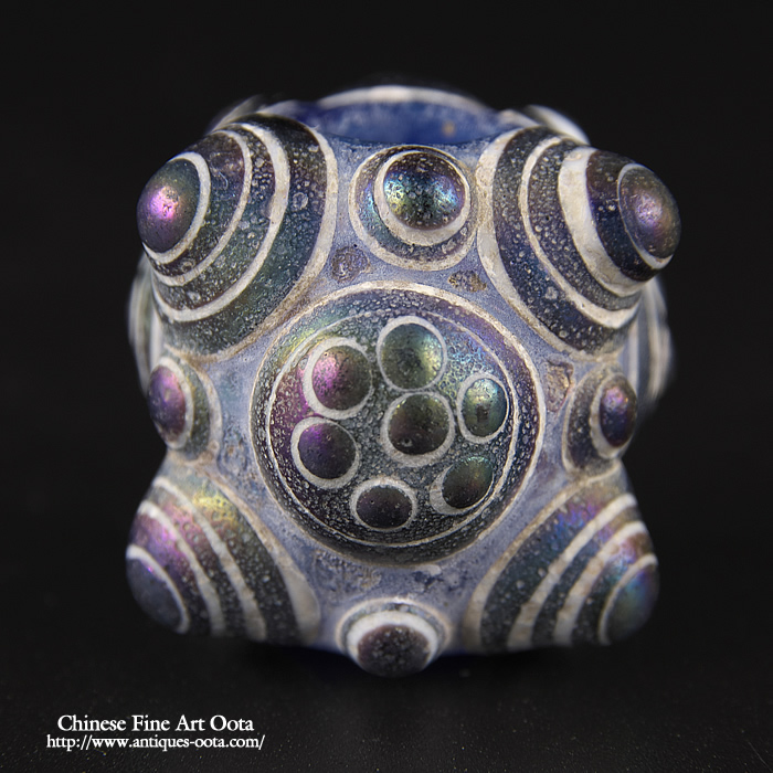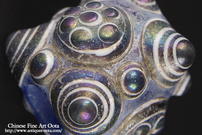 長管トンボ玉と共におそらくガラス工房跡から出土。ルーペで見ると一層美しい。