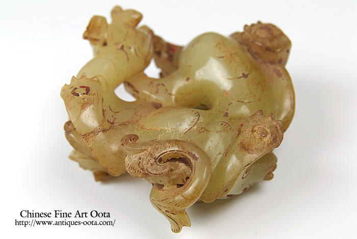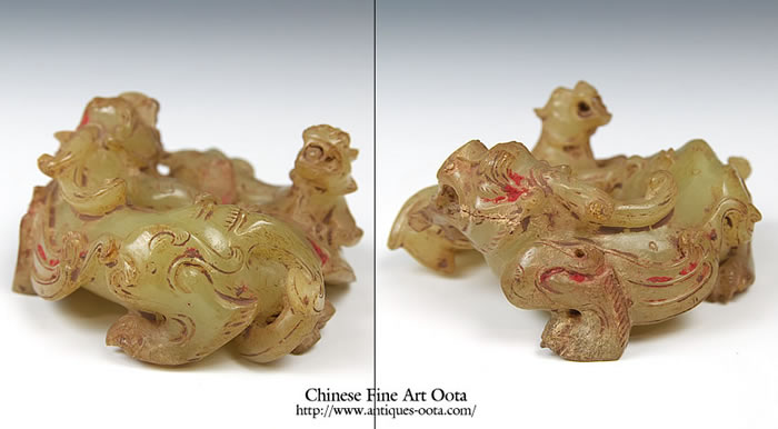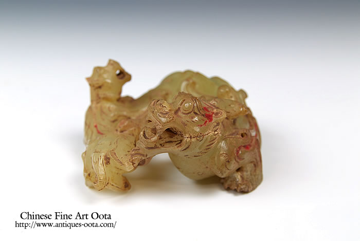 咆哮し、じゃれる親子ち虎を円形に纏めている。本来全体に朱がまぶされていたようで、あちこちに見られる。朱砂は鮮血の象徴であり、辟邪降魔の力を備えていると考えられた。 玉は「清明の玉気。能く神と通ず」といわれるように、心霊世界との媒介物として役立ったし、不祥を避け悪気を除く呪力があると考えられた。雌獅子と戯れる小獅子は子孫繁栄・権力永久を象徴する。