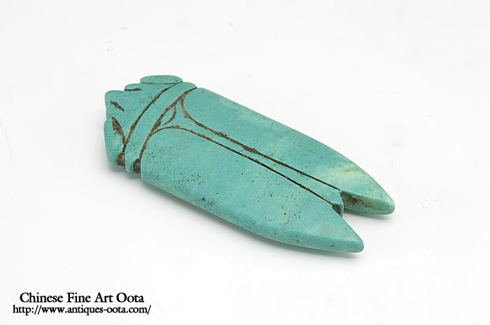 漢八刀の鋭さが真に迫る形態としている。神仙思想が発生して玉蝉を口に含ませて埋葬することは漢代にもっとも盛んとなるが、玉含はすでに新石器時代に出現している。 緑松石は稀少。 緑松石産地は湖北省北山。 参照:GK-599 、GK-723