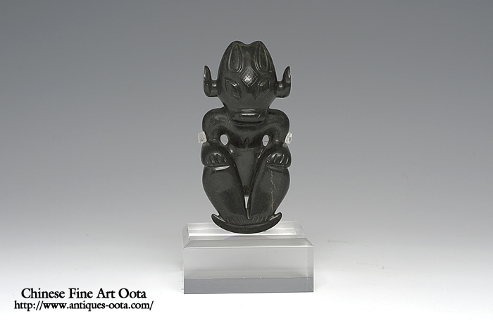 紅山文化(BC4000〜BC3000) 作行き鋭利、抜群の墨玉(黒皮玉)製。 眼・指・耳などの線刻も厳しく、細部にわたり丁寧な彫琢。額には斜線文の刻。 墨玉・黄玉は古代においても貴重・人気であったと思われる。原始美術で此れ程の芸術性高い作品は稀。 香港著名玉収蔵家より数年がかりで懇請買入れ。 参照:GK-981