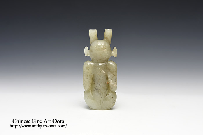 玻璃光ある良質白玉が局部変色し、古玉鑑賞の魅力を増している。精微・均整のとれた造形で自立する。