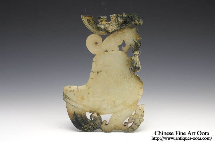 大きな神鳥の上部には龍・人物を、左下方には龍を複合させる周代玉器に特徴的な「人龍合一」形状。見事・強烈な臣字眼、体表の瑞雲刻は極めて厳しく鋭利。