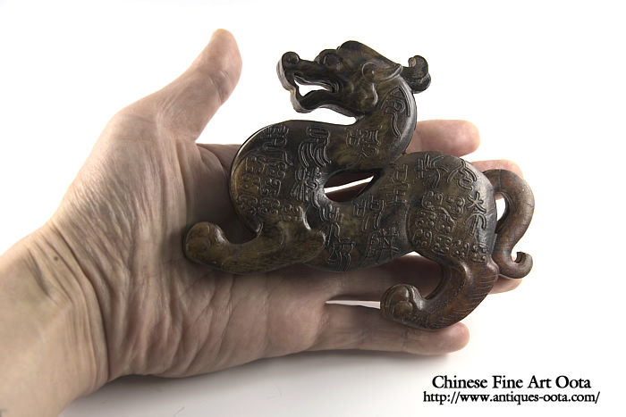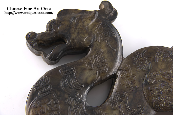 大型割符。内平面には篆書で「師兵」。 体表には片面12文字の篆書と瑞雲が密に陽刻。泌化により赤褐色が局部緑色で変化色は古玉最大の魅力であり、真贋判定の決め手ともなる。これほどの大型符は初見。篆書が解読できれば、さらに貴重資料。 香港著名玉商旧蔵品。長年の懇情により入手。 参照:GK-1300