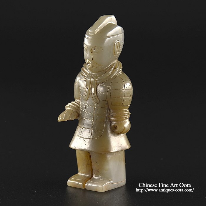長髭・長襦の上に鎧・スカーフ・革靴等、兵馬俑と同態様の出で立ちの兵士。 玉製は希少。富者の装飾品。 手元に置けば悠久2000年余、始皇帝時代の雰囲気が醸される愛らしい賞玩品。 参照:DK-699、DK-588