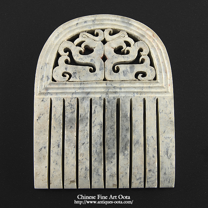 上部、半円型内に双龍が鋭利に透彫。 青玉が泌化により全体白濁色となり、古玉鑑賞の魅力を増している。 実用品で同形状の彩漆器櫛も知られる。 参照:GK-338