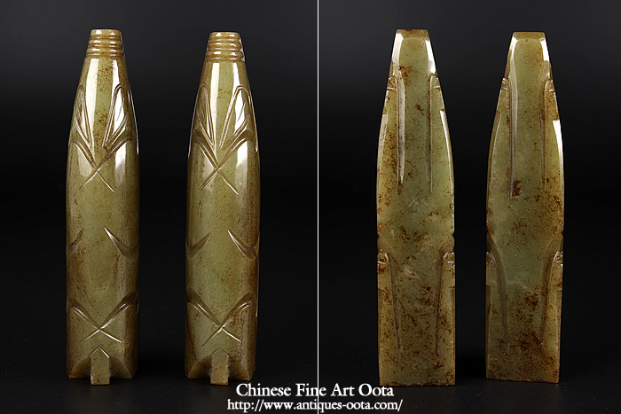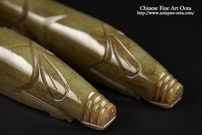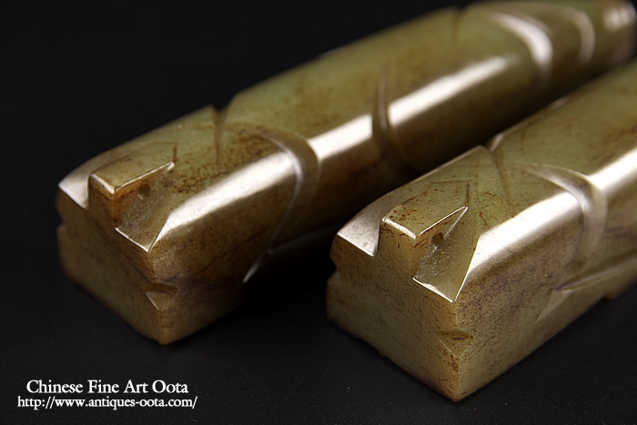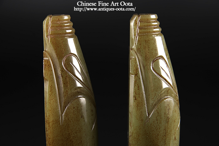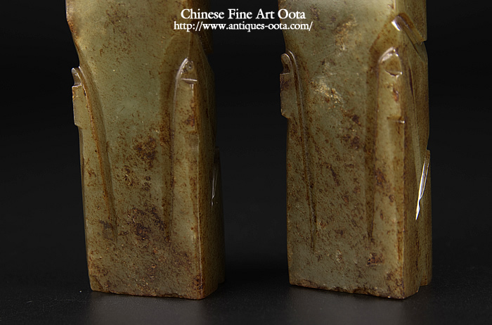 最良和田青玉で見事な「漢八刀」の彫技。玻璃光表面全体に泌化褐色斑が見られ古玉鑑賞の醍醐味も有る魅力的な逸品。