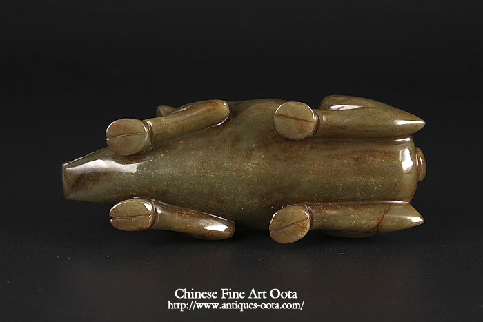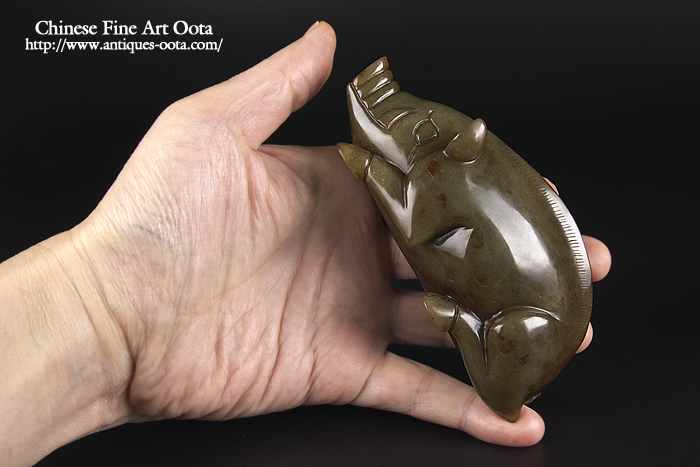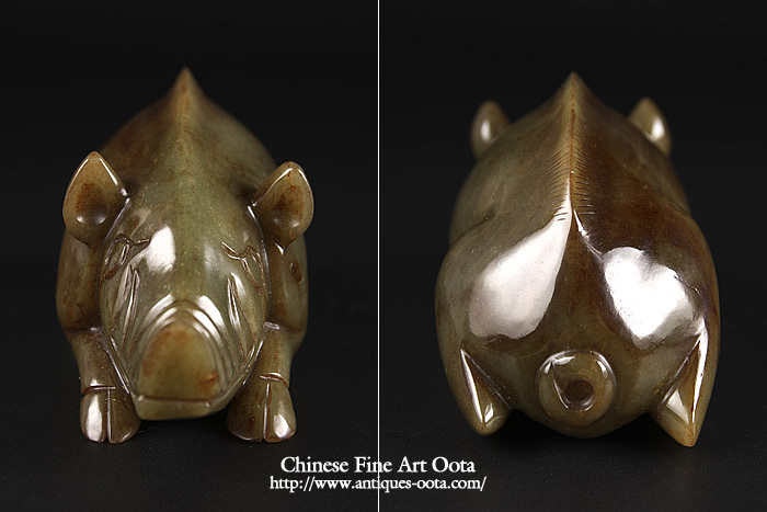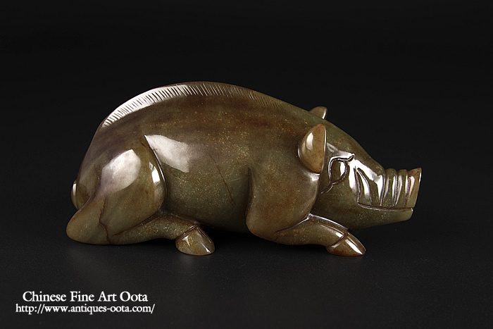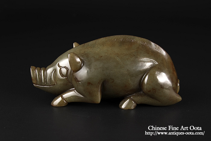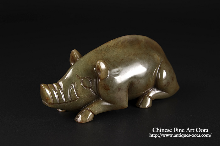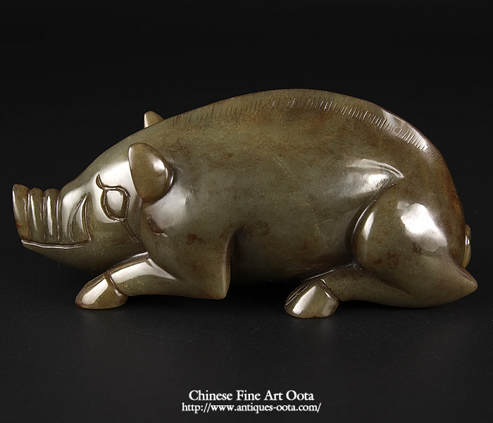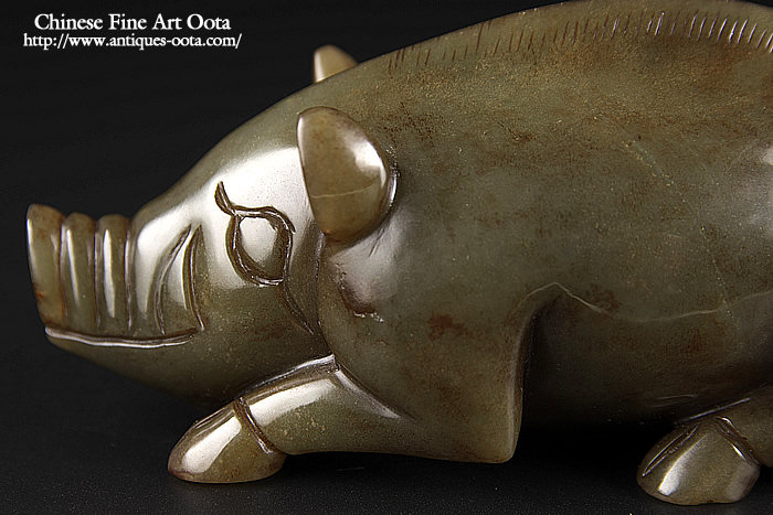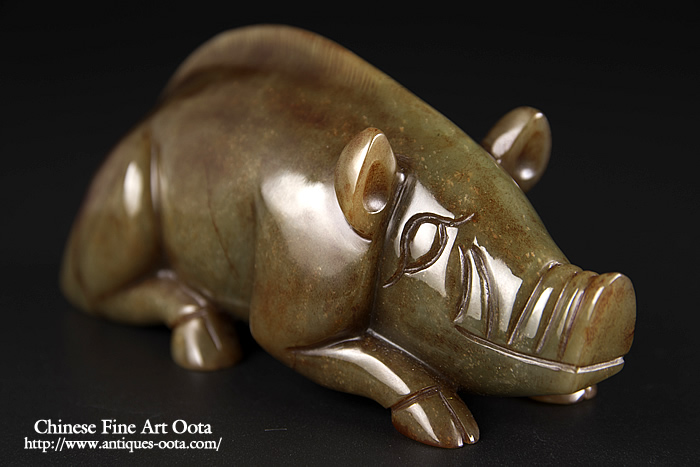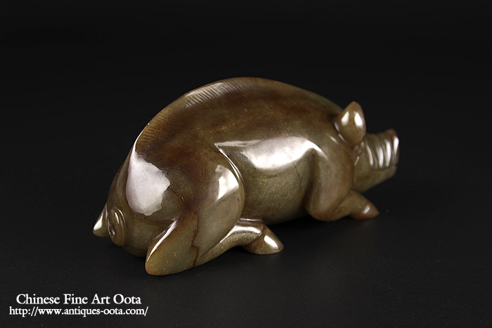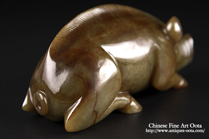 写実的造形に迫る力強く鋭利な漢時代特有の形姿。見事に豚の動態を捉えている。