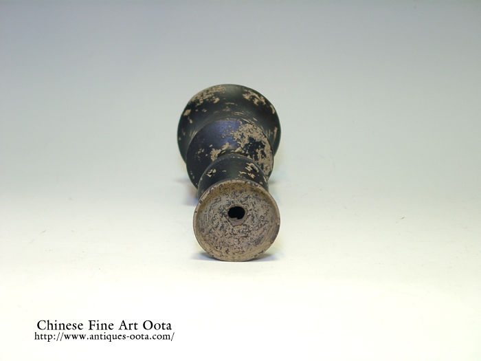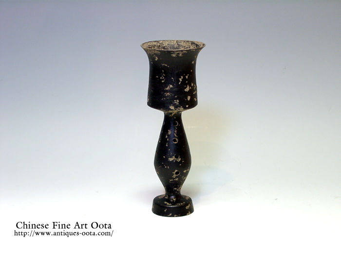 龍山文化。 黒色磨研土器の代表的器形であるワイングラス形。上部の杯部と下部の脚部を別々にロクロ引きして結合。厚さは、0.5〜1.0ミリメートル前後で極めて薄く、卵殻土器ともいわれる。薄い黒陶は欠け易く、割れ易いので素地上に細かな粘土を用い、低温度でよく焼き締めるよう工夫されている。脚部のすかし模様、全体の造型は洗練された感覚を示す。