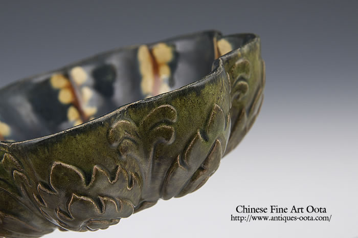 内面は藍地に2列の列点繋ぎ文を11本中心に向け構成し、中心線に褐釉を施す。背面は宝相華文を中央に、八方に花文を型押しで意匠される。裏面には3ヶの小目跡が見られる。梅花は三彩器文様として間々見られる。原型はササン朝ペルシャの銀器。