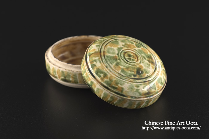 白釉地に緑・黄釉を美しく密に装飾した愛らしい瀟洒な作品。西アジアの金属器を倣っている。