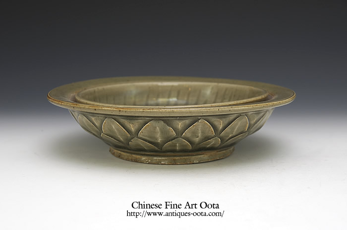 文様の線は伸び伸びとし、刻線の箇所は釉色が濃く、文様を浮き立たせ、浮彫りの様な美しさを見せる。オリーブグリーンの色が美しい耀州窯中の精品。