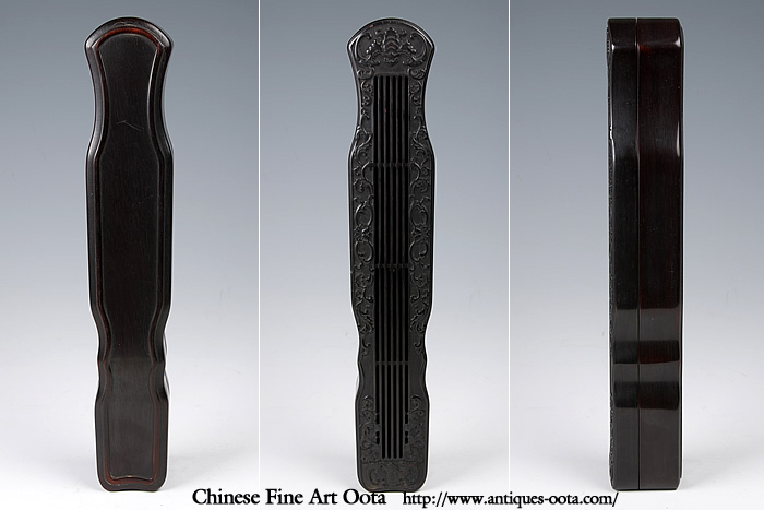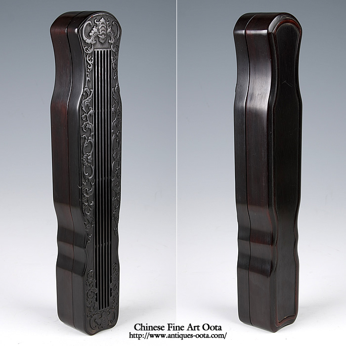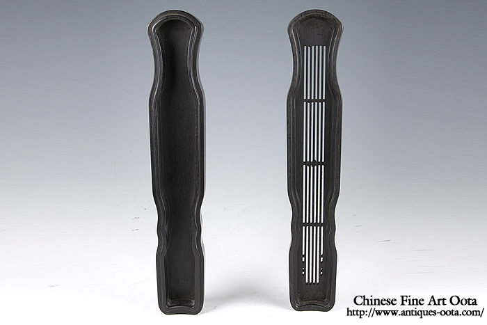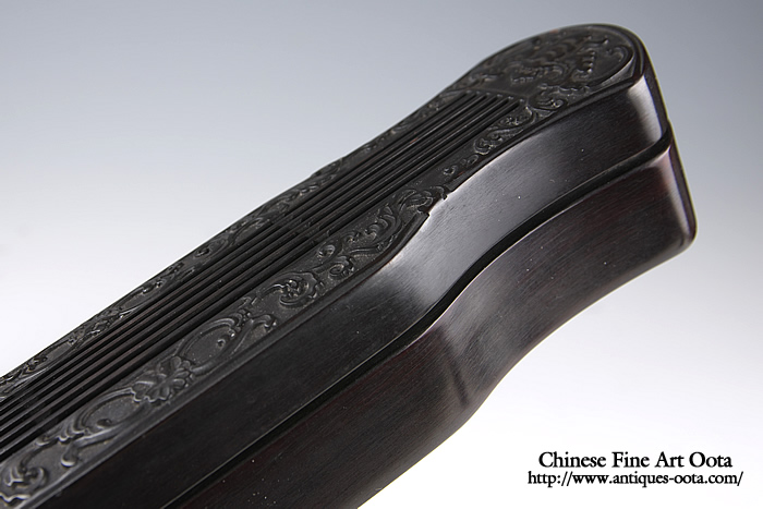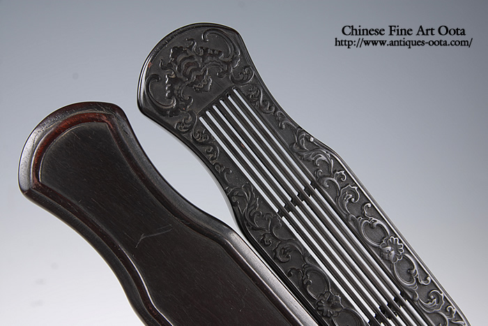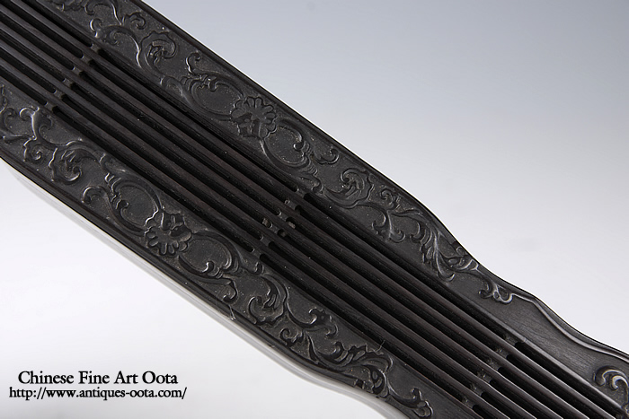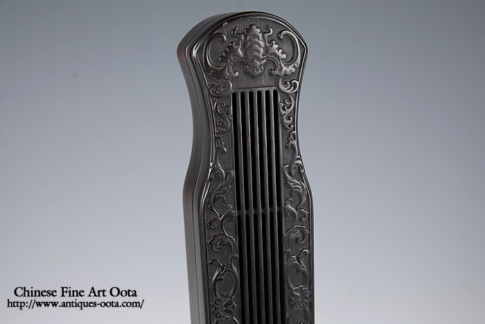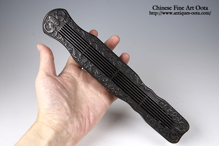 琴型の蓋上面には上下に蝙蝠、間には花唐草紋が刻され琴線状に透彫された線香入れ。